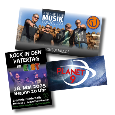 Plakate, Flyer und alles, was die Band und Auftritte sichtbar macht. -